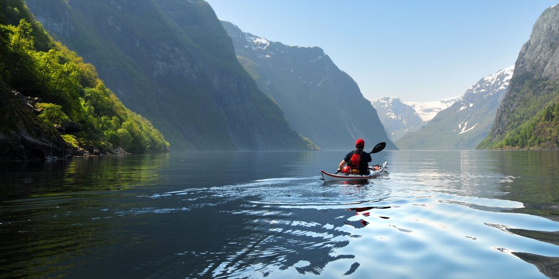 Att få paddla kajak i området kring Flåm är en naturupplevelse. Här får man vara nära naturen och uppleva hur det känns att ta sig fram i vattnet tillsammans med andra trevliga människor.